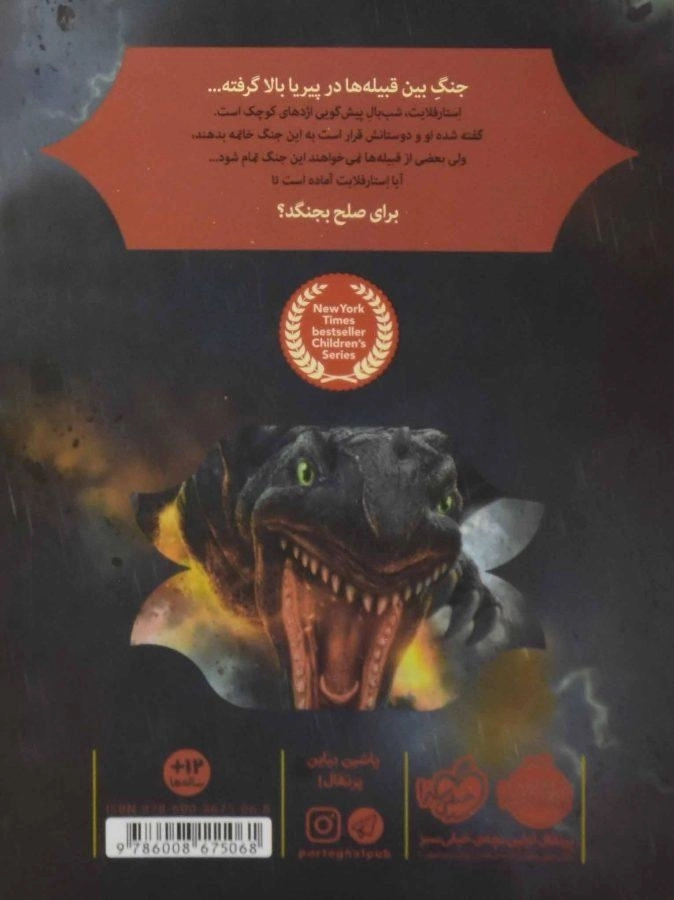 استارفلایت از وقتی غار زیر کوه را ترک کرد، چندین بار ترسیده بود. فکر می کرد هیچ جیزی نمی تواند وحشتناک تر از زمانی باشد که ملکه اسکارلت با نگهبان هایش آمد و دیون را کشت و همه ی اژدها زاده ها را زندانی کرد، ولی بعد از آن وقتی بود که توی میدان مسابقه ایستاد و می دانست اسکارلت می خواهد او تا آخر روز به طرز وحشتناکی کشته شود. بعدش هم زمانی بود که ملکه کورال دستور داد آن ها را بیندازند توی زندان و سونامی از وسط مارماهی الکتریکی پرید و آسمان بال ها به قصر تابستانی حمله کردند و بدون این که فکری بکنند از وسط جنگ فرار کردند. ولی شاید بدتر از همه وقتی بود که توی جنگل انبوه، سانی جلوی چشمش غیب شد. البته این ها غیر از همه ی ترس هایی بود که از زمان آمدنش به قبیله ی شب بال ها دچارشان شد. در واقع چند هفته ی پیش را مدام با ترس گذراند. ولی این یکی چیز دیگری بود. جوری ترسید که با خودش گفت: ((این از نظر علمی اصلا امکان نداره؛ یعنی از اون موقع تا الان زیر مواد مذاب بوده؟)) مدام می گفت: امکان نداره و این که: کارم ساخته ست. کسی نیست ازم محافظت کنه. از توی مواد مذاب و طلایی، اول از همه سر و بال هایش و بعد بچه هایش بیرون و کناره های دیگ را توی چنگش گرفت. خودش راتکان داد و مواد مذاب را پاشید این طرف و آن طرف. چیزی نگذشت که مواد مذاب از روی سرش ریخت پایین، و گردن خیلی کلفت و پوزه اش که زخم چنگ داشت و فلس های سیاهش نمایان شد که مثل چوب آبنوس براق توی مواد مذاب نارنجی رنگ اطرافش می درخشید. فیت اسپیکر که پنجه هایش را مثل دیوانه ها تکان تکان می داد هول هولکی آهسته گفت: ((یه کاری بکن)) استارفلایت یواش جواب داد: ((مثلا چی کار کنم؟)) تونل درست آن طرف دیگ بود. اگر می خواستند فرار کنند باید از اژدها و مواد مذابی که به اطراف می پاشید عبور می کردند...