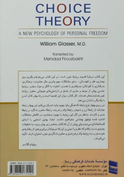 کتاب تئوری انتخاب به قلم ویلیام گلسر قصد دارد اهمیت روابط خوب را در شکل گیری یک زندگی موفق بررسی نماید. تئوری انتخاب نظریهای است که بر اساس آفرینش انسان تدوین شده و چون انسان دارای قدرت انتخاب و تصمیم گیری میباشد، پس مسئولیت رفتارهایش نیز با خودش است و هر کدام از این رفتارها میتواند روی شکل گیری روابط و نحوهی زندگیاش نیز تأثیرگذار باشد.