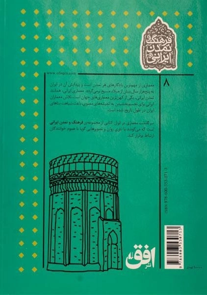 در این جلد از مجموعه ی فرهنگ و تمدن ایرانی به شاخه ی معماری پرداخته می شود. در بررسی هر تمدنی یکی از مواردی که به آن بسیار توجه شده و مورد بررسی موشکافانه قرار می گیرد، معماری آن تمدن و سرزمین است. قدیمی ترین آثار کشف شده در حفاری های باستان شناسی که وجود اولین بناهای معماری در ایران را نشان می دهد متعلق به چیزی در حدود شش هزار سال پیش است. این بناها که به تپه زاغه مشهور هستند در جنوب قزوین فعلی قرار دارند و قدیمی ترین محل استقرار کشاورزی درایران را نشان می دهند. در اکتشافات این محل 21 خانه ی خشتی شناسایی شدند که همگی نقشه هایی چهارگوش داشته و از سمت شمال غربی به سمت جنوب غربی کشیده شده بودند، دلیل قرار گیری این خانه ها بدین شکل به دلیل کم کردن اثر بادهای مزاحم کویر (رازباد) باد گرم کویر و (مه باد) باد سرد کویر بوده است. در بررسی معماری ایران زمین به ترتیب زمانی هفت شیوه به چشم می خورد که در این اثر هر کدام از این شیوه های خاص معماری مورد بررسی قرار گرفته اند. این هفت شیوه عبارتند از: پارسی، پارتی، خراسانی، رازی، آذری، اصفهانی و تهرانی می باشند. هر یک از این شیوه های معماری خود تاثیر گرفته از روشی دیگر بوده همچنین بر راه و رسم معماری پس از خود نیز تاثیر گذاشته اند. در هر بخش از کتاب تصاویر بسیاری از آثار به جای مانده از هر دوره ی معماری در ایران به تصویر کشیده شده است.