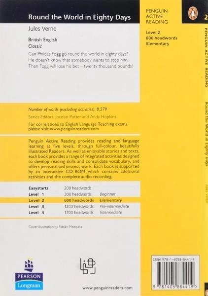 کتاب داستان Round the world in eighty days در دوازده فصل با نام های فیلیس فاگ و پاسپورت، شرط بندی، کاراگاه فیکس، هند، آودا، کلکته، هنگ کنگ ، به سوی ژاپن؟، به سوی سن فرانسیسکو، در طول آمریکا، در طول اتلانتیک، پایان سفر توسط ژول ورن نویسنده بزرگ نوشته شده است. این کتاب شامل 8579 کلمه است که مختص سطح ابتدایی elementary است و همچنین شامل شش فعالیت است که پس از مطالعه هر فصل می توانید به آن ها پاسخ دهید. این تمرینات درصدد ارتقای سطح فهم comprehension زبان آموزان است چرا که سوالاتی را در خود جای داده است که با مطالعه هر فصل می توانید به راحتی به آن ها پاسخ دهید و علاوه بر Reading سایر مهارت های خود را نیز ارتقا دهید.
