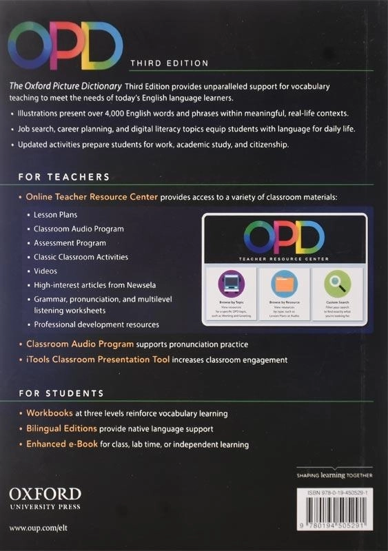 کتاب Oxford Picture Dictionary (اکسفورد پیکچر دیکشنری) یکی از بهترین و کاربردیترین کتابهای آموزشی و خودآموز (Self Study) برای یادگیری زبان انگلیسی بهشمار میآید که باعث تقویت مهارتهای شنیداری (Listening) گفتاری (Speaking) و افزایش دایره لغات (Vocabulary) زبان آموز میشود که زبان آموزان در همه سطوح به راحتی میتوانند از آن استفاده کنند.
