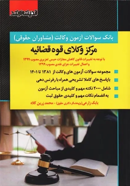 کتاب بانک سوالات آزمون وکالت (مشاوران حقوقی) از انتشارات اندیشه ارشد با توجه به تغییرات کانون و کاهش مجازات حبس تعزیزی مصوب 1399 و اعمال تغییرات جزای نقدی مصوب 1399 نگاشته شده است. کتاب از مجموعه سوالات آزمونهای وکالت سالهای قبل تشکیل شده و همراه با پاسخ تشریحی میباشد، از نکات مهم این اثر ذکر رفرنسهای معتبری است که از آنها استفاده شده است. همچنین دارای 2000 نکته مهم و کلیدی از مباحث آزمونها است. ویژگی دیگر اینکه، نکات مهم و کلیدی حقوق ثبت در کتاب ارائه شده است. کتاب ویژه داوطلبین آزمونهای وکالت مرکز و وکلای قوه قضاییه تالیف گردیده.